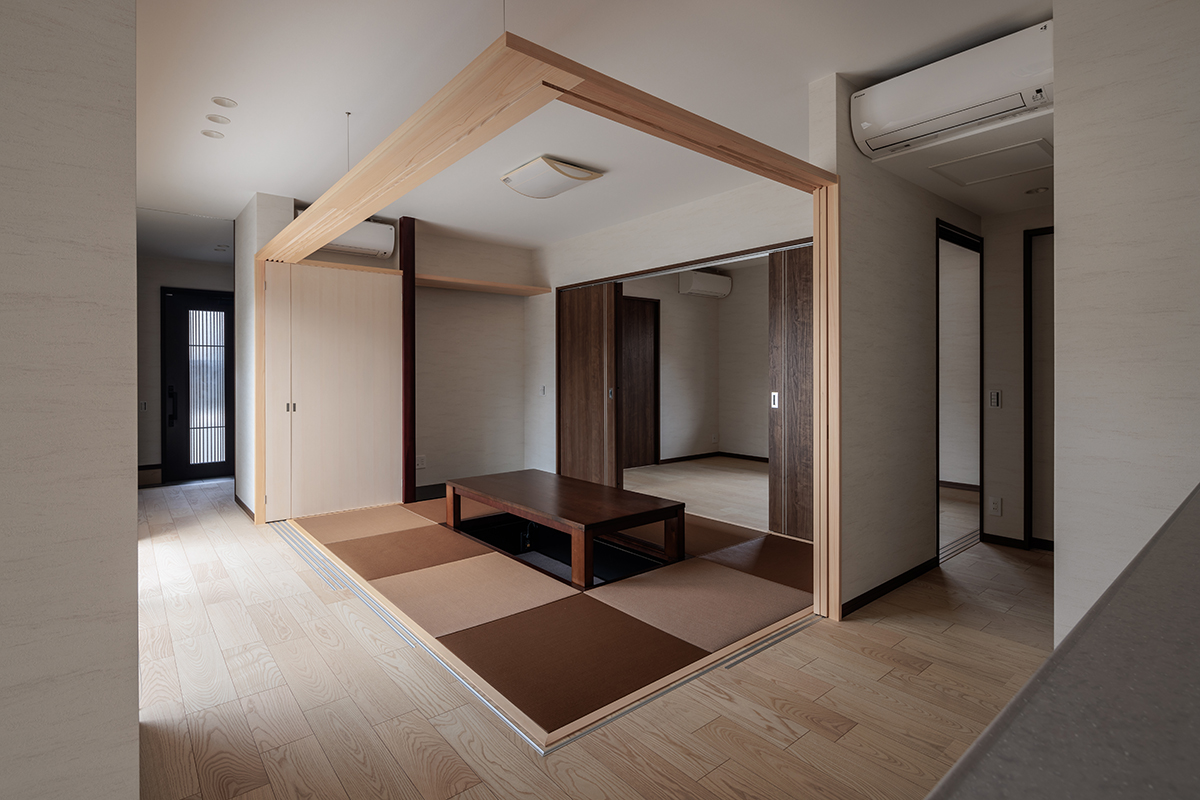 足が疲れにくい掘座卓(ほりごたつ)を採用した、くつろぎ重視の和室です。畳には茶系の縁なし半畳畳をセレクト。定番の緑色とは異なるカラー畳は、モダンな家具とも相性抜群で、お部屋を一気にスタイリッシュに見せてくれます。仕切りには引き込み式の障子を採用。来客時には閉めて客間として使い、普段は全開にして開放感あふれるリビングの一部として活用できる、柔軟性の高い設計です。